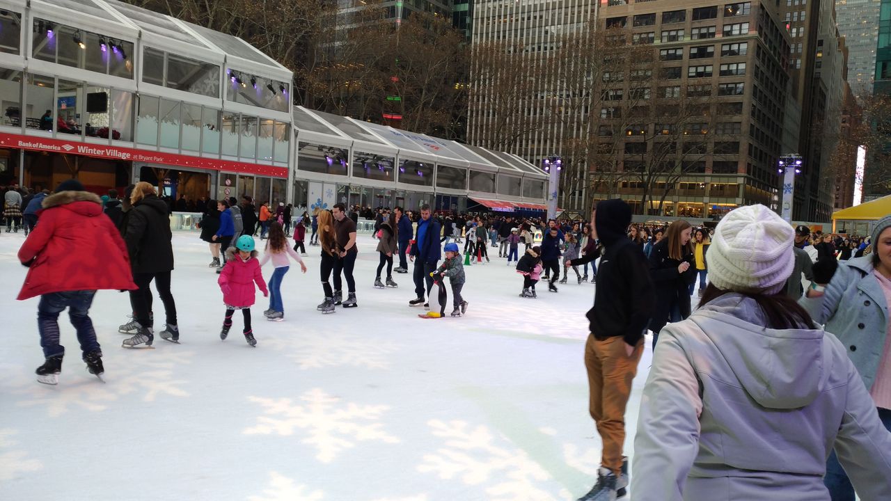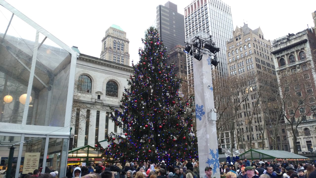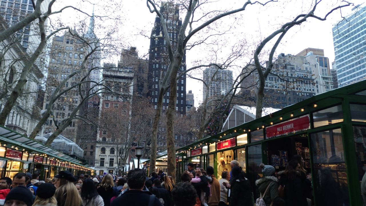 土曜の午前は長男の補習校があるため、それが終わってお昼を食べたあと、電車でグランドセントラル駅まで来ました。まず42thストリートを歩きます。この時期はホリデーシーズンなので、観光客も多く街はとてもにぎわっています。タイムズスクエアの近くのブライアントパーク(Bryant Park)は、この時期、たくさんのギフトショップが所狭しと並ぶ場所に様変わりします。
