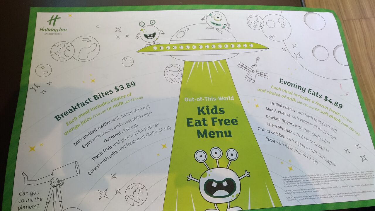 昨日の記事に書いたとおり、朝食付きのプランだったんですが、朝食は大人分だけでした。子供は、軽いセットなら無料で頼めるけど、大人と同じビュッフェの場合には一人5ドルかかるとのこと。軽いセットは、下の写真の左側にあるワッフルやエッグ、フルーツから、どれか一つ選びます。我が家は、それで十分ということにしました。