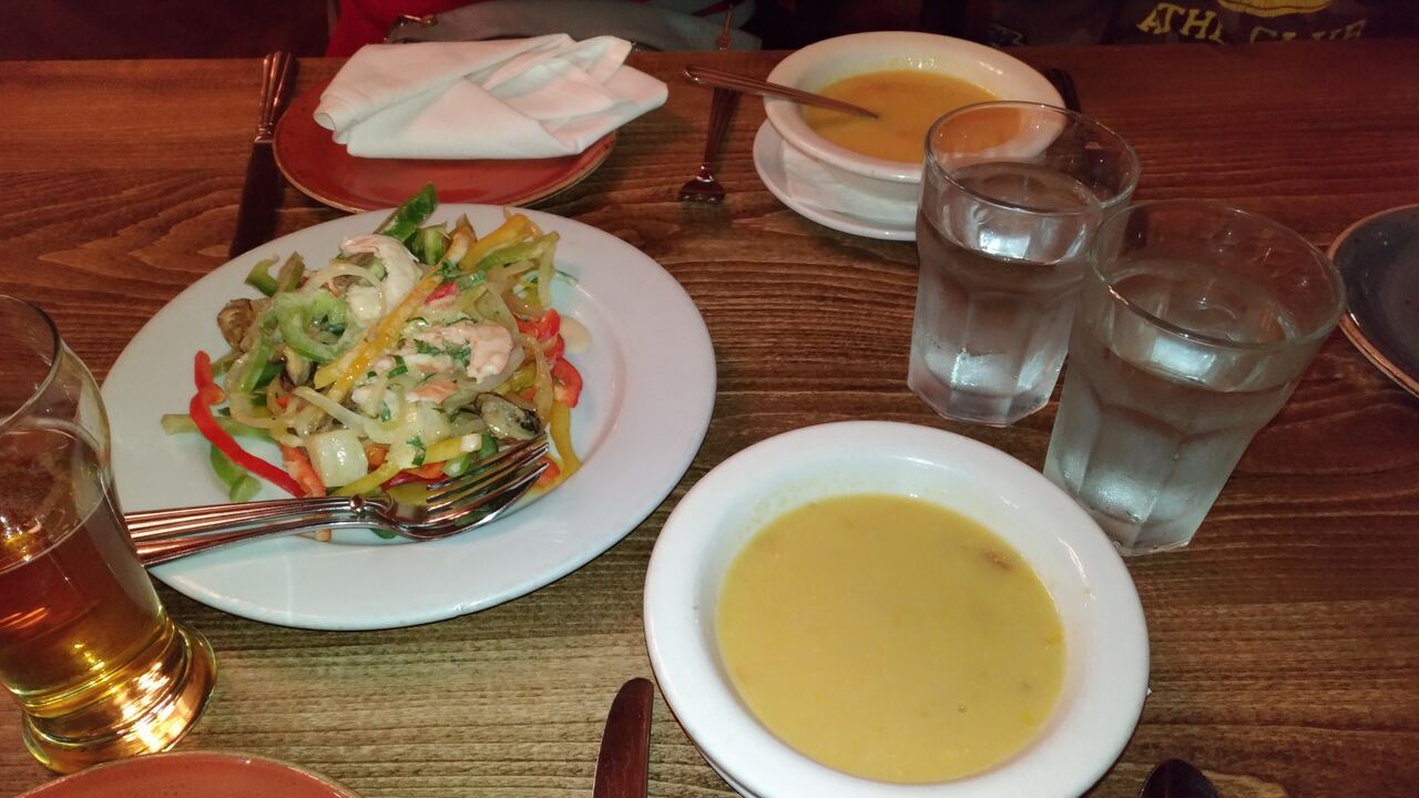 シーフードサラダとスープ。このシーフードサラダもとても美味しかった。