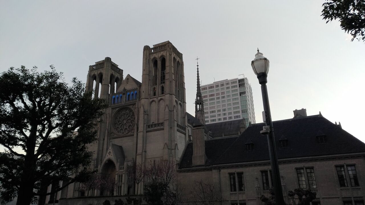 バスを乗り継いでホテルに戻り、1時間ほど休憩しました。17時頃、またケーブルカーに乗って、何度も通り過ぎたグレース大聖堂に行きます。本当はグレース大聖堂の中を少し観光するつもりだったんですが、残念ながらこの時間はもう閉まっていました(しかもこの翌日から、数日間クローズということで、結局、中には入れませんでした)。代わりに(?)、大聖堂の向かいにあるプレイグラウンドで子供たちを少し遊ばせました。