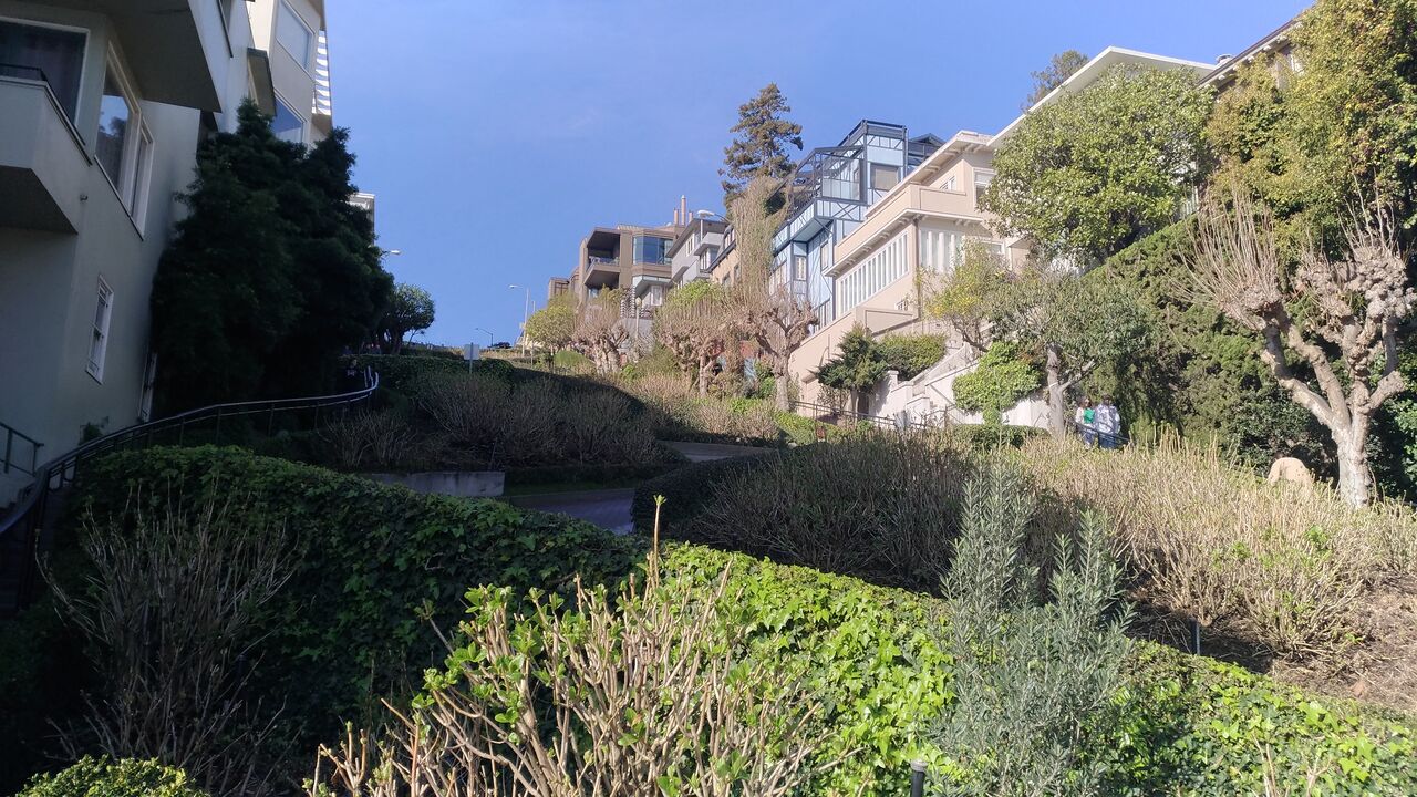 Powell-Hyde Lineはケーブルカーの中で最も人気の線で、この時間でも混んでいて1本目は乗れませんでした。2本目になんとか乗ることができ、Lombardという停留所で降ります。ここはサンフランシスコの観光名所として有名なロンバード・ストリートのうねうね坂があるところです。