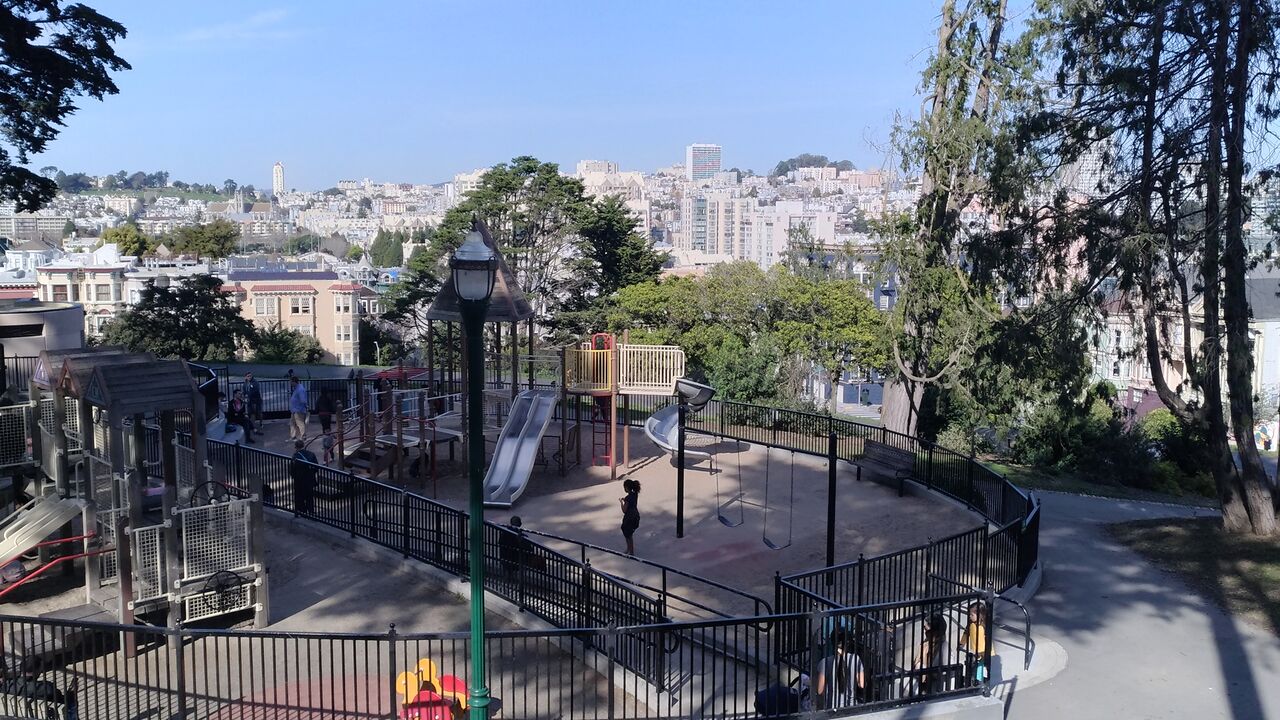 マクドナルドで腹ごしらえしてからAlamo Square Parkへ。バスで1駅くらいです。ここにはプレイグラウンドもあり、子供たちは大喜びで遊んでました。まあ子供は、観光よりも遊びかもしれません。。。